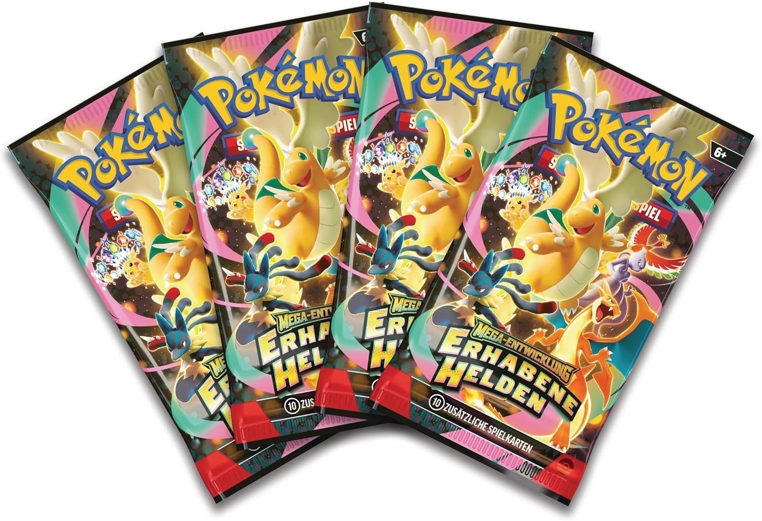 • 1 holografische Promokarte: Mega-Meganie-ex • 1 überdimensionale Wackelbild-Promokarte: eine der oben genannten Karten • 4 Boosterpacks aus „Mega-Entwicklung – Erhabene Helden“
