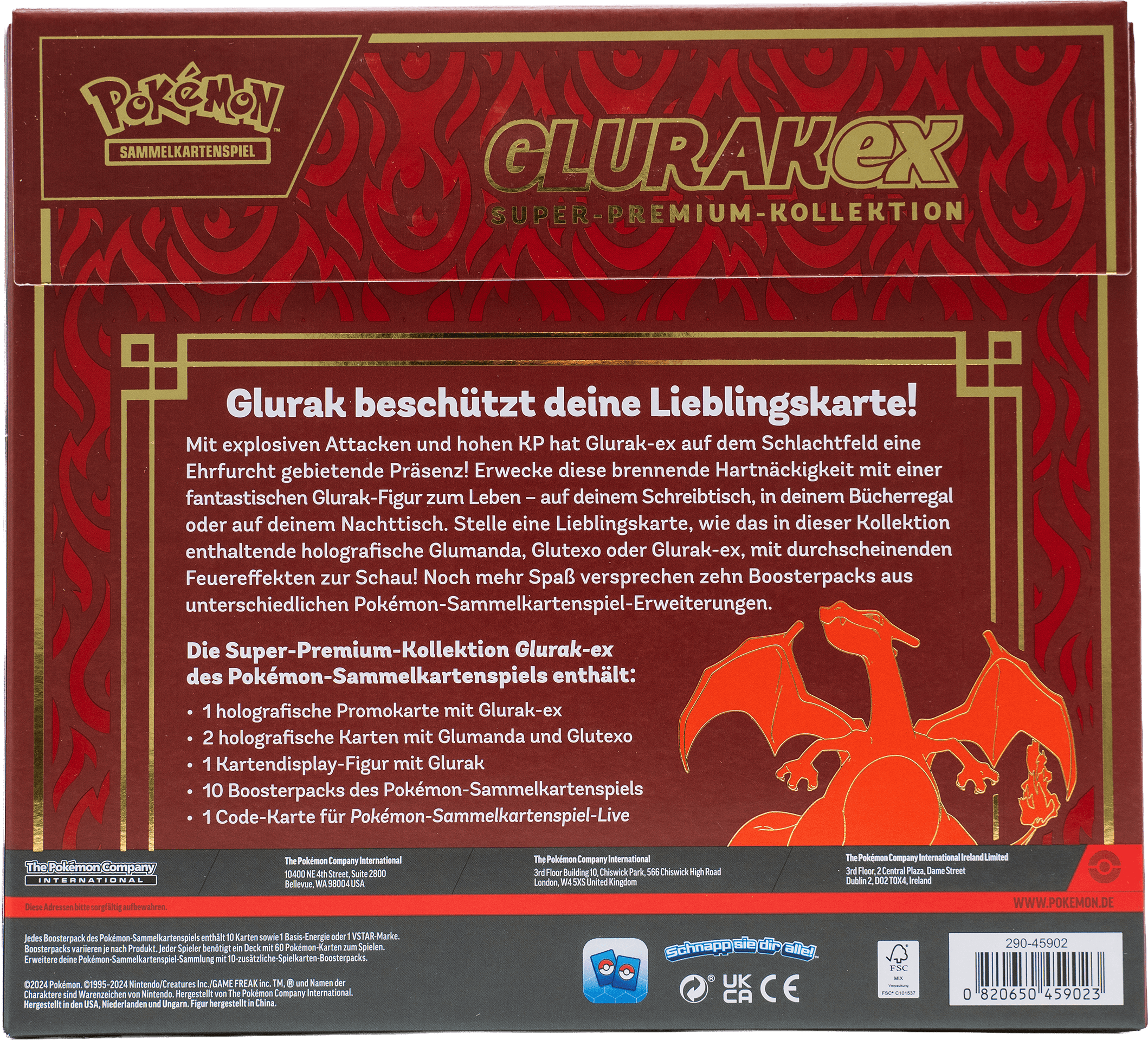 Die Glurak ex Super Premium Kollektion ist ein luxuriöses Bundle rund um den ikonischen Feuerstarter aus Kanto mit chinesischer Verpackung. Enthalten sind 10 Boosterpacks aus Scarlet & Violet-Sets (z. B. Stellar Krone, Maskerade im Zwielicht, Paradox Rift), 1 foil Glurak ex Promo-Karte, 2 foil Karten (Glumanda, Glutexo), eine Glurak-Figur als Kartendisplay, eine XXL-Karte und exklusives Zubehör wie Hüllen oder Münzen. Ideal für Sammler und Spieler ab 6 Jahren, die die vollständige Glurak-Linie mit hoher Hit-Chance erwerben wollen.