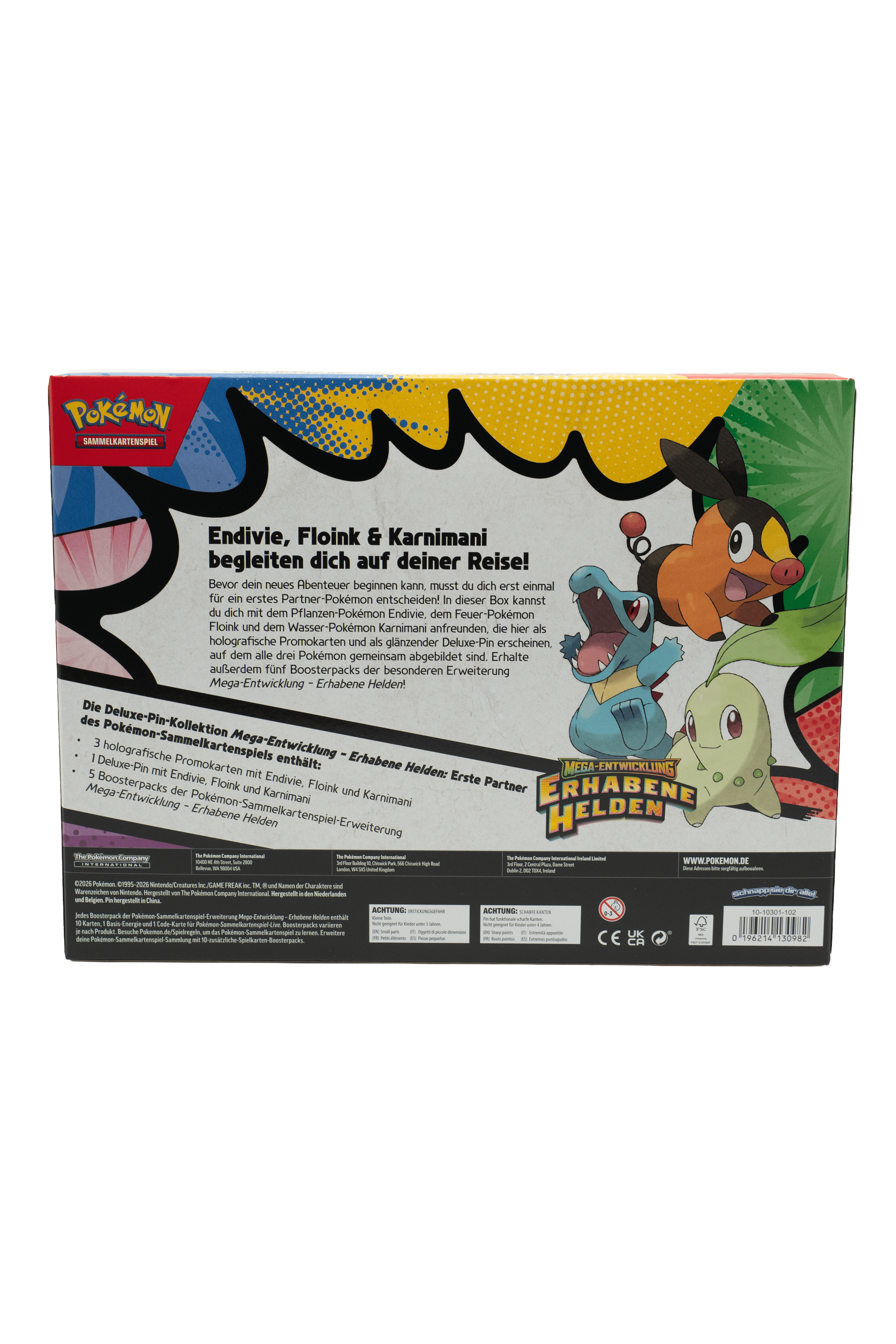 Jedes Pokémon-Abenteuer startet mit einer wichtigen Entscheidung: Welches erste Partner-Pokémon wählst du? In dieser Box lernst du das Pflanzen-Pokémon Endivie, das Feuer-Pokémon Floink und das Wasser-Pokémon Karnimani kennen – alle drei gibt es hier als holografische Promokarten und zusammen auf einem glänzenden Deluxe-Pin. Zusätzlich bekommst du fünf Boosterpacks der besonderen Erweiterung Mega-Entwicklung – Erhabene Helden!